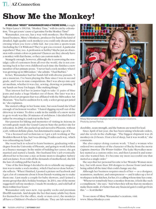 My name is Missy Wanamaker and I am the artist behind these playful, sweet, and creative creatures you see stocked in this online boutique. Over the last several years, my company has risen as one of the leading purveyors of these unique toys in the United States and offers the largest variety of first-class designed sock monkeys. In fact, I offer over 300 varieties of these cuties and each one is guaranteed to be handmade using premium knit socks, hypoallergenic fiberfill and batting, embroidery floss, felt, ribbon, and assorted embellishments.